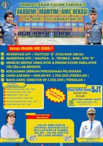 Akademi Maritim AMC Bekasi membuka pendaftaran Calon Taruna Angkatan 39 Tahun Akademik 2026/2027 untuk tiga program studi unggulan, yaitu Nautika, Teknika, dan Ketatalaksanaan Pelayaran Niaga (KPN). Program pendidikan dirancang berbasis disiplin, karakter, dan kompetensi maritim yang selaras dengan kebutuhan industri pelayaran nasional maupun internasional. Dengan dukungan dosen berpengalaman, fasilitas praktik yang memadai, serta kurikulum terarah, AMC Bekasi berkomitmen mencetak perwira dan profesional maritim yang siap kerja dan berdaya saing tinggi.
